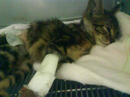 發現小貓脊椎挫傷及後腳有骨折現象,醫師隨即將小貓清洗完並插管安排住進保溫箱治療。